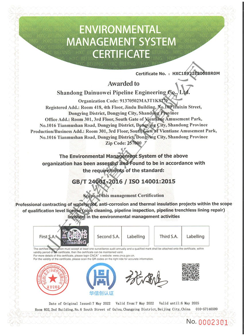 管道非開挖修復工程服務企業資質證書